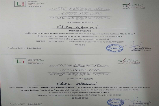 比赛分为才艺表演和知识问答两个环节。在第一个环节中,陈婉霓同学围绕中意文化交流这一主旨,结合主持、歌唱等表演形式,穿插引用耳熟能详的中意歌曲和意大利经典电影片段,引发评委和观众共鸣,暗合本届意大利语言文化周主题——“电影中的意大利语”。10分钟的精彩表演收获阵阵掌声,得到在场评委观众的喜爱和好评。在第二个环节中,陈婉霓同学准备充分、从容应对,展现了良好的知识储备和语言综合应用能力。综合两个环节,陈婉霓同学最终以发音与语言流畅度单项和总分均第一的成绩脱颖而出摘得桂冠,并且获得最佳发音奖。