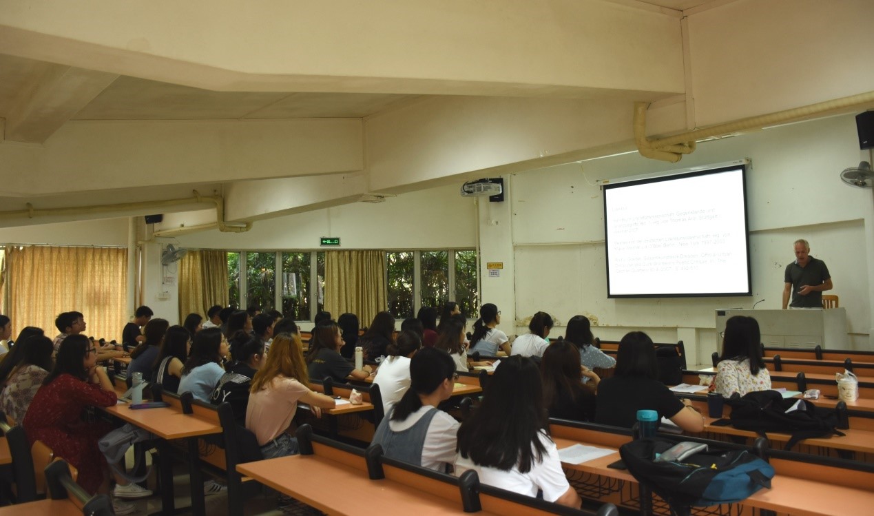 报告开始,德语系主任卢铭君教授首先对塞德尔教授表达了热烈的欢迎。她谈到,文学一直是我系教学和研究的重点之一。塞德尔教授表达了对卢教授的感谢,同时介绍了一些有助于学生文学素养的书籍和视频,开拓了我们的视野。