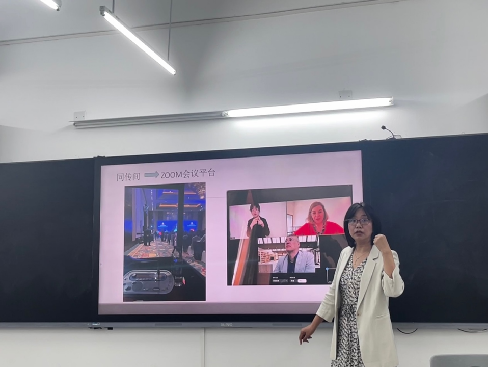 接着,张晏老师分享了自己的多次在线翻译经验。疫情使得译者的工作场所由同传间转变为各种会议平台。尽管疫情已经结束,但如今越来越多的会议或活动依然以线上或线上线下相结合的形式举行。这对译者也提出了除翻译技能以外的新要求——熟练使用各种不同的在线会议平台。通过自身的翻译实践,张晏老师认为疫情后时代要求译员拥有更强的同时处理多项任务的能力,更强的沟通能力和更强的现场应变能力。