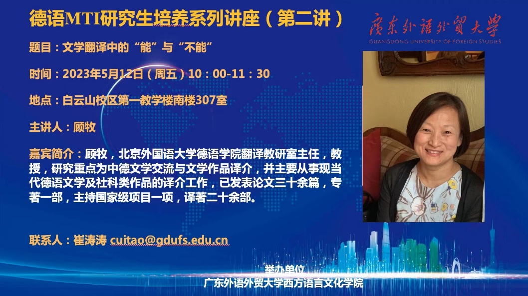 讲学,为德语口译MTI专硕点开展了一场题目为《文学翻译中的“能”与“不能”》的学术讲座。讲座吸引了学院多个语种的研究生、高年级本科生以及部分青年教师前来参加。本次讲座由德语MTI点负责人崔涛涛副教授主持。