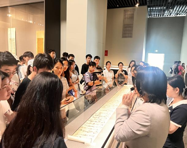 在博物院讲解员的带领下,师生们一起参观了“泛彼无垠——广州艺术博物院藏历代书法精品展”,本次展览以“唐人写经”“明代书法”“清代书法”“近现代书法”四个单元呈现,展出作品创作年代跨度长,形式多样,篆、隶、草、楷、行五体俱全,文辞内容丰富,涉及佛教经典、诗文词赋、文房楹联、往来书信、书评画论等内容。历代众多名家书法佳作齐聚一堂,展览作品风格各异,从豪迈古韵到自然出新,无不展现了中国书法艺术的博大精深和独特魅力,师生们在参观中也更加坚定了文化自信。