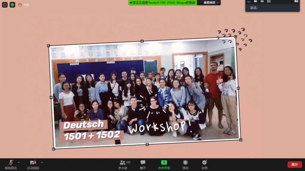 欢送会的最后,大家一同观看了德语系为两位外教精心制作的欢送视频。从彼此的相识,再到参加大大小小的活动,彼时再平常不过的点滴,在此刻看来却如此珍贵美好。看着与外教之间共同度过的大学生活被用心记录下来,同学们反应热烈,在聊天框里分享自己的不舍和美好祝愿。两位外教Ira和Anja表达了她们的不舍之情,怀念在中国生活和教学的日子,怀念与同学们和老师们在一起的时光,同时祝愿大家意气风发,准备好带着梦想奔赴新的远方。