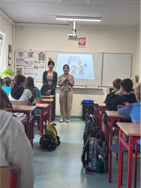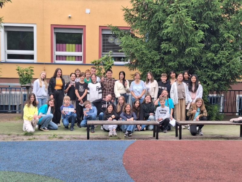 2024年6月14日,德语2021级学生陈佳敏、方怡霖等,在波兰老师的带领下参观了什切青(Szczecin)当地一所中小学,向小学生教授了中文的自我介绍和问好方式,并介绍了中国的饮食和节日文化。活动受到当地学生的欢迎和喜爱。小朋友们热情介绍了他们的学校,还教了中国客人们一些实用波兰语。最后同学们送给小朋友们每人一张中国明信片作为留念。