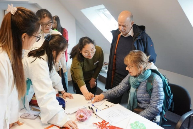 2024年4月20日,德语2021级学生张赫菱、江林颖作为志愿者,在德国帕德博恩孔子学院参与了国际中文日活动。活动中,交换生们用德语向前来参加活动的国际友人讲解了中国的十二生肖文化,并为他们分析了各自对应的中国生肖。更有趣的是,他们还教外国朋友如何在书签上正确地书写自己的中文名字以及对应的生肖汉字。在生肖转盘游戏中,一位德国女孩因为转到了自己对应的龙肖像而格外兴奋,她欣喜地向大家展示了身上龙纹样式的T恤,展现出对中国文化的浓厚兴趣与热爱。活动结束时,外国朋友们将写好的书签当作纪念礼物带走收藏,这一幕让交换生们深切地感受到学好一门外语的优势。