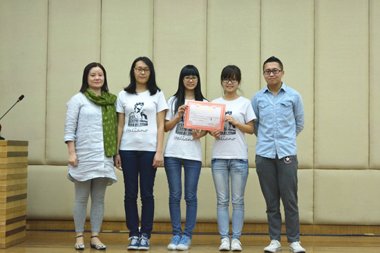 最终,来自意大利语系的队伍“Rio”凭借《里约大冒险》荣获一等奖,来自德语系的队伍“进击的雪(xue)宝(ba)”和来自法语系的队伍“MAD-L”分别凭借《冰雪奇缘》和《小淘气尼古拉》荣获二等奖,来自俄语系的队伍“三个人的车站”和来自葡萄牙语系的队伍“山腰六神庙”、“Canarinho”分别凭借《两个人的车站》、《直到命运将我们分开》和《家庭战争》荣获三等奖。