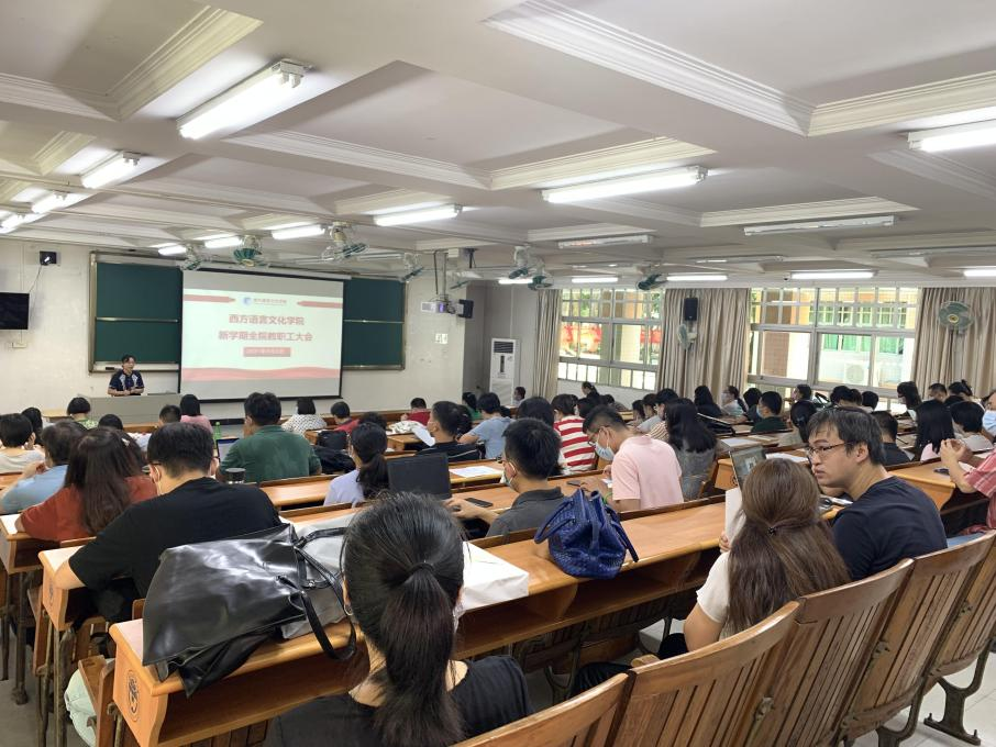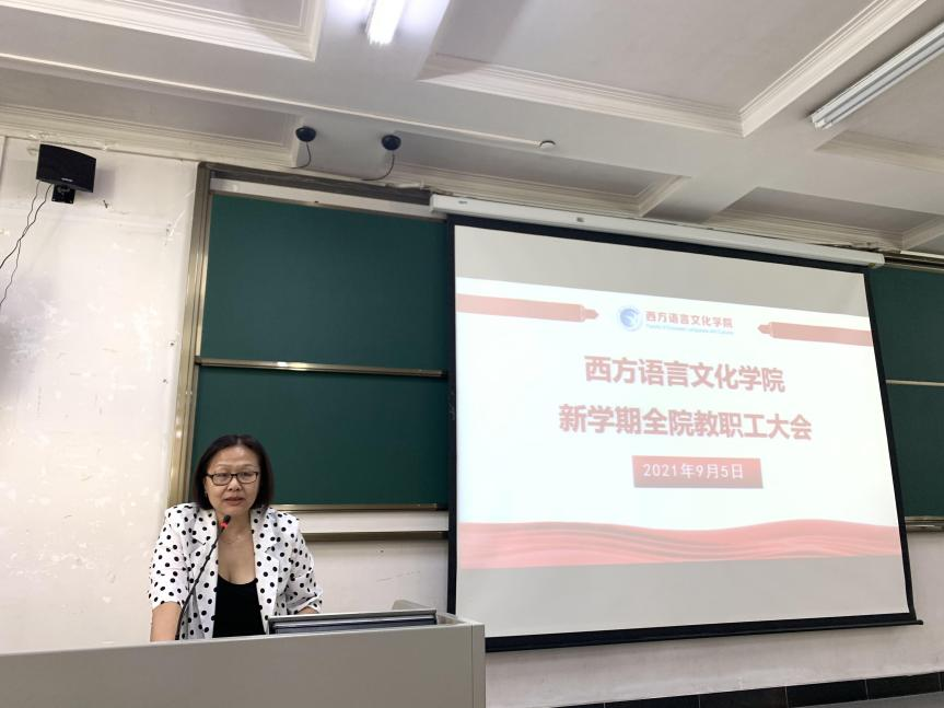 敖湘晖首先向全体教师介绍了本学期新加入捷克语系的高晓潼老师,俄语系黄时勋老师完成全部的教学工作,光荣退休。她指出,人才引进是学院的重要工作,上学期各系在人才引进方面做出了很大的努力,为学院的发展注入了新鲜血液,要继续做好传帮带和教师培养工作,更好的服务学校高水平大学建设。