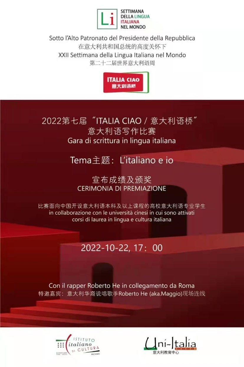 “ITALIA CIAO/意大利语桥”比赛由意大利驻华使馆文化处创办于2014年,是国内面向意大利语专业学生最重要的国家级比赛之一。比赛于每年10月的世界意大利语周期间举行,每年设定一个与意大利语周相关的主题。2022年的比赛首次采用写作形式,以L’italiano e io(意大利语与我)为题,吸引了来自全国21所高校的共计69名学生参与(其中本科组59名,硕士生组10名)。10月22日,于第二十二届世界意大利语周闭幕式之际,意大利驻华使馆文化处通过线上的方式举行了颁奖仪式。