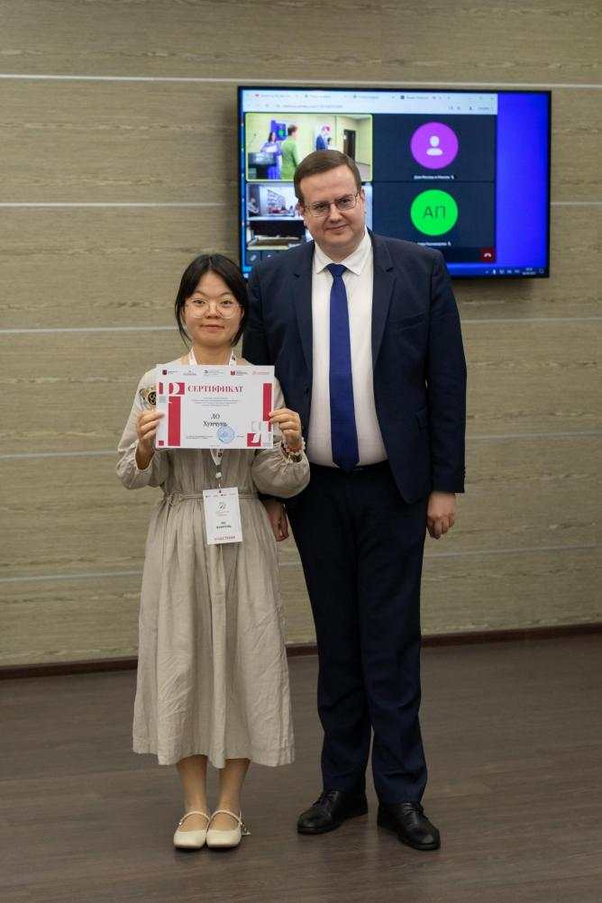 普希金俄语学院代理院长尼基塔·古瑟夫为罗虹春颁发课程证书