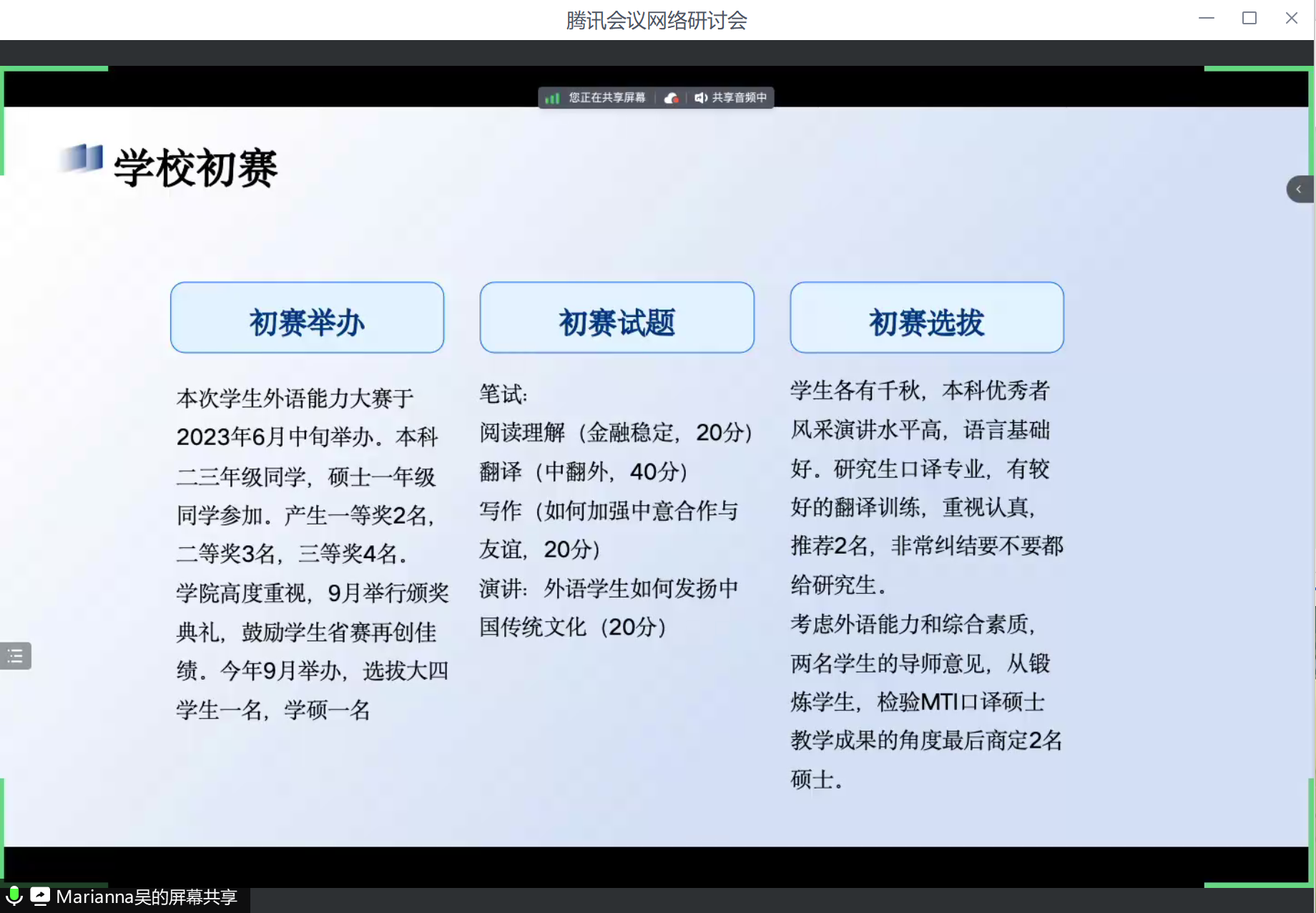 紧接着,吴菡老师展示了对外经济贸易大学校内初赛的筹备与选拔情况,参考大赛样题设计模拟试卷进行选拔,尽可能将机会平等给予各个学段的学生。另外还结合贸大特色专业课程与教学,向a片无码