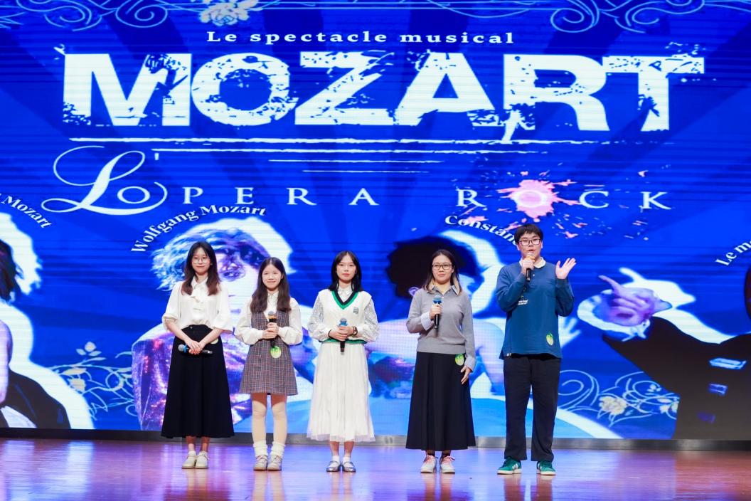 在第一轮自选片段演绎中,法语系代表队选取了法语音乐剧《摇滚莫扎特》中的片段。该片段兼具鲜明的音乐剧艺术特点,台词情感层次丰富,唱段演绎难度较高,且人物台词节奏紧凑、角色声线风格差异显著,对配音演员提出了极高要求。在张洁老师的悉心指导下,参赛队员凭借良好的专业技能与默契的协作,在赛场上呈现出了富有感染力的配音表演,赢得评委团与现场观众的赞誉。