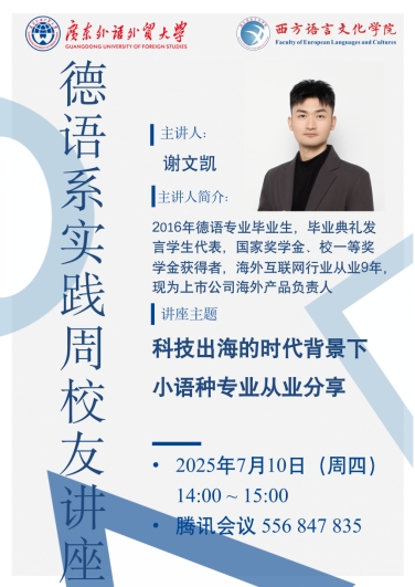 德语系于教学实践周举办校友讲座,邀请2016级德语专业优秀毕业生、上市公司海外产品负责人谢文凯校友,以“科技出海的时代背景下小语种专业从业分享”为主题,与师生展开深度交流。本次讲座由德语系张思源老师主持,院党委副书记魏少娟老师致辞,副院长卢铭君老师出席,吸引了包括德语系在内的多个语种专业学生参与。